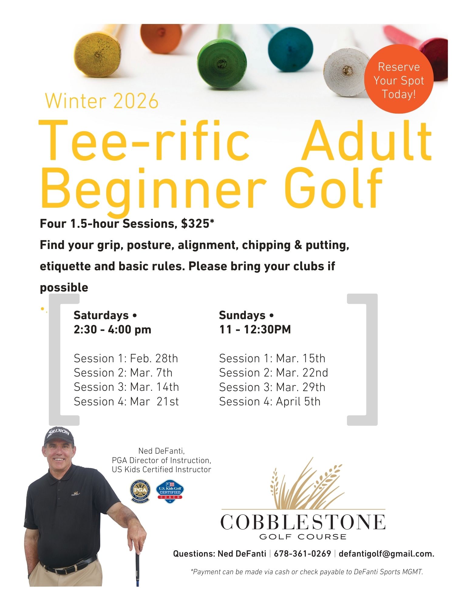 Each four-week program is limited to eight participants. Please bring your clubs if you have them. This class is designed for Beginner Ladies and Men.